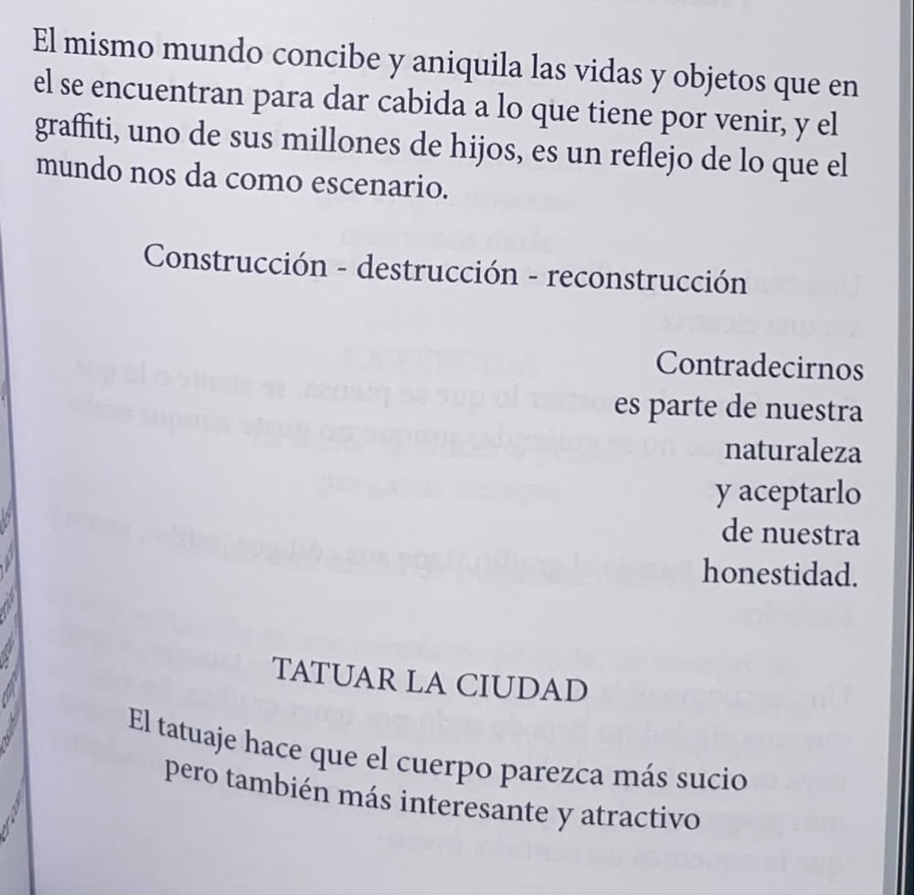 es una excusa para hablar de muchas cosas, realmente quería hacer un libro que fuera un vómito de muchas ideas, un libro que fuera entretenido para mi madre, que se la suda el graffiti, un libro sobre graffiti disfrutable para quien le gusta y lo conoce y para quien vive ajeno a ello y le da igual. Sin tecnicismos ni cosas así, con faltas de ortografía, bueno no sé, ya lo veréis.